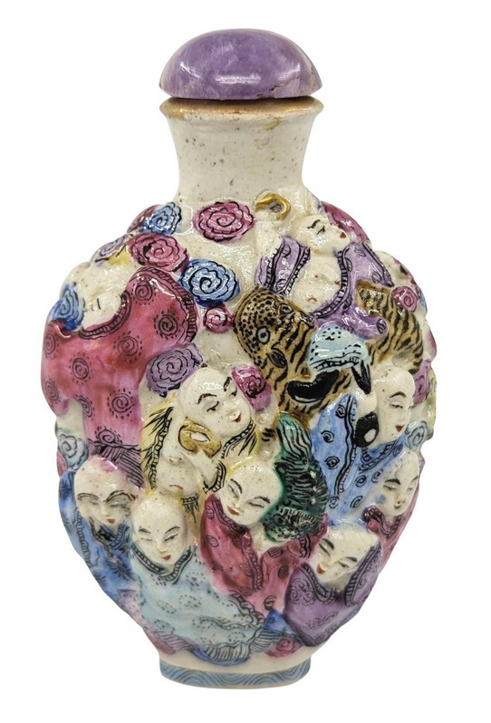 Antique Chinese Moulded Porcelain 18 Arhats Luohan Snuff Bottle Qing Late 18c