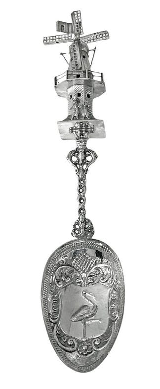Nauseatingly detailed. The windmill rotates and I think that’s wonderful. Probably a nightmare to clean and polish. Everyone’s meal should be made whimsical by such a utensil. This spoon sent me on a rabbit hole through an obscure silver forum.4 Take a look if you want.