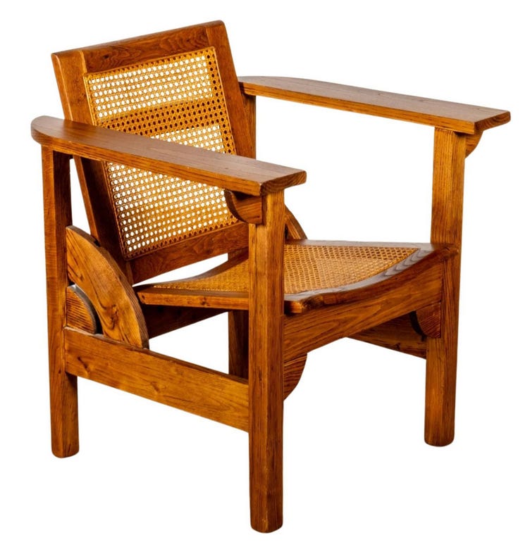 Lovely silhouette. Good angles. And French! Beautiful cane weaving, very 30s. Consistent in its language. Really clean condition, too. Fold-able into three different positions. How perverted.